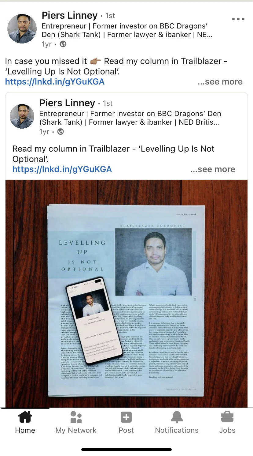Piers Linney talking about his column with Trailblazer on LinkedIn.